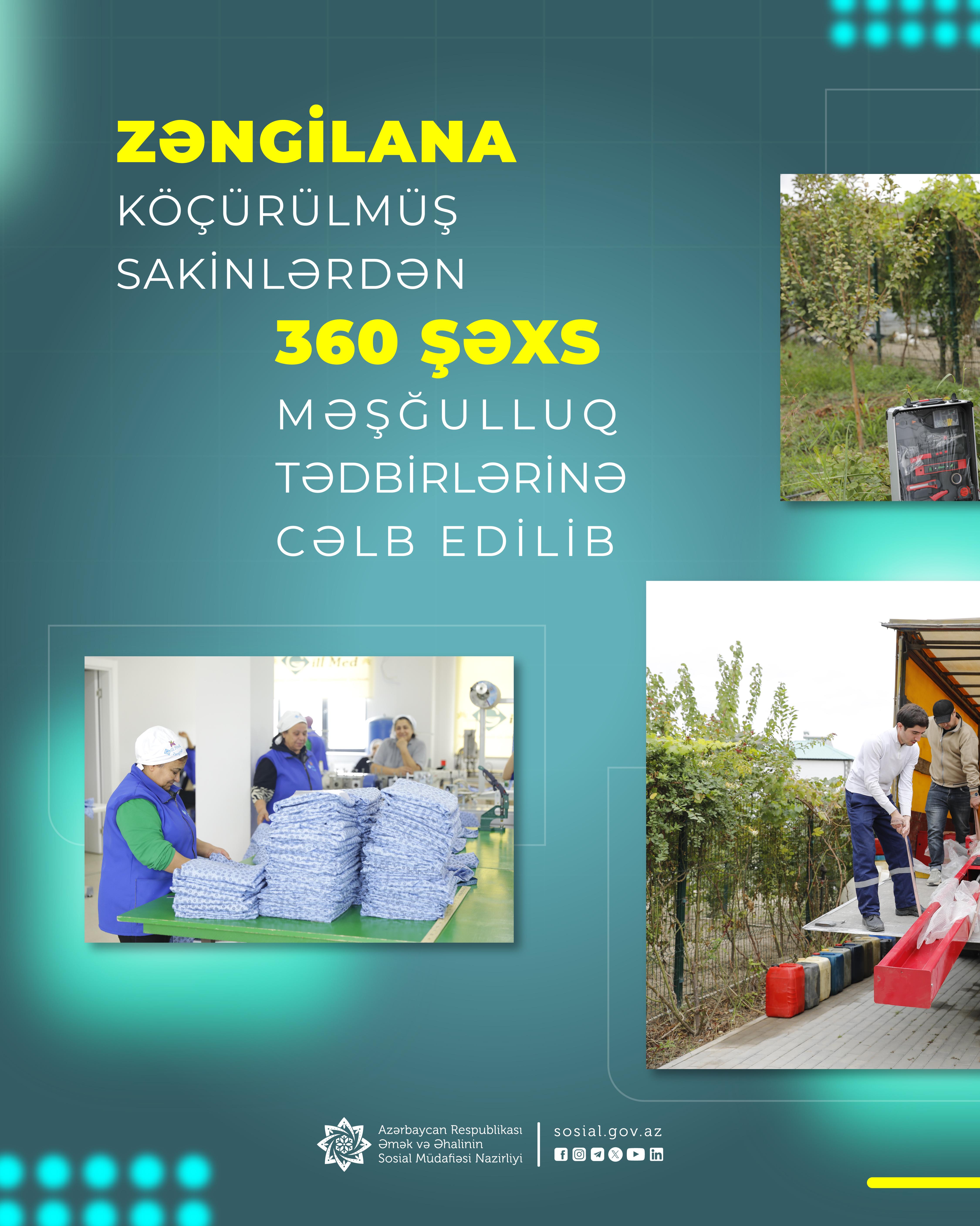 Əmək və Əhalinin Sosial Müdafiəsi Nazirliyinin tabeliyində Dövlət Məşğulluq Agentliyi Zəngilan rayonuna köçürülmüş sakinlərlə bağlı aktiv məşğulluq tədbirlərini davam etdirir.